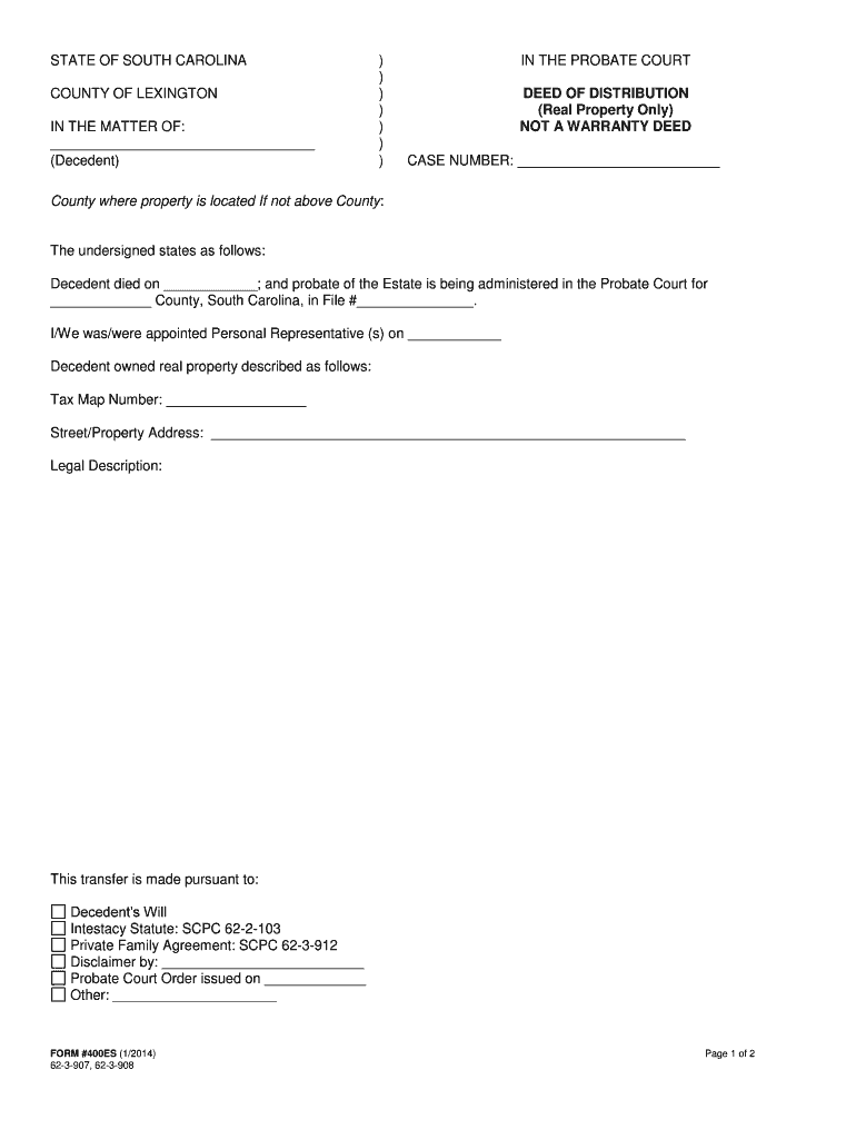 STATE OF SOUTH CAROLINA COUNTY OF LEXINGTON IN THE MATTER OF: (Decedent)))))))) IN THE PROBATE COURT DEED OF DISTRIBUTION (Real Property Only) NOT A WARRANTY DEED CASE NUMBER: County where property
