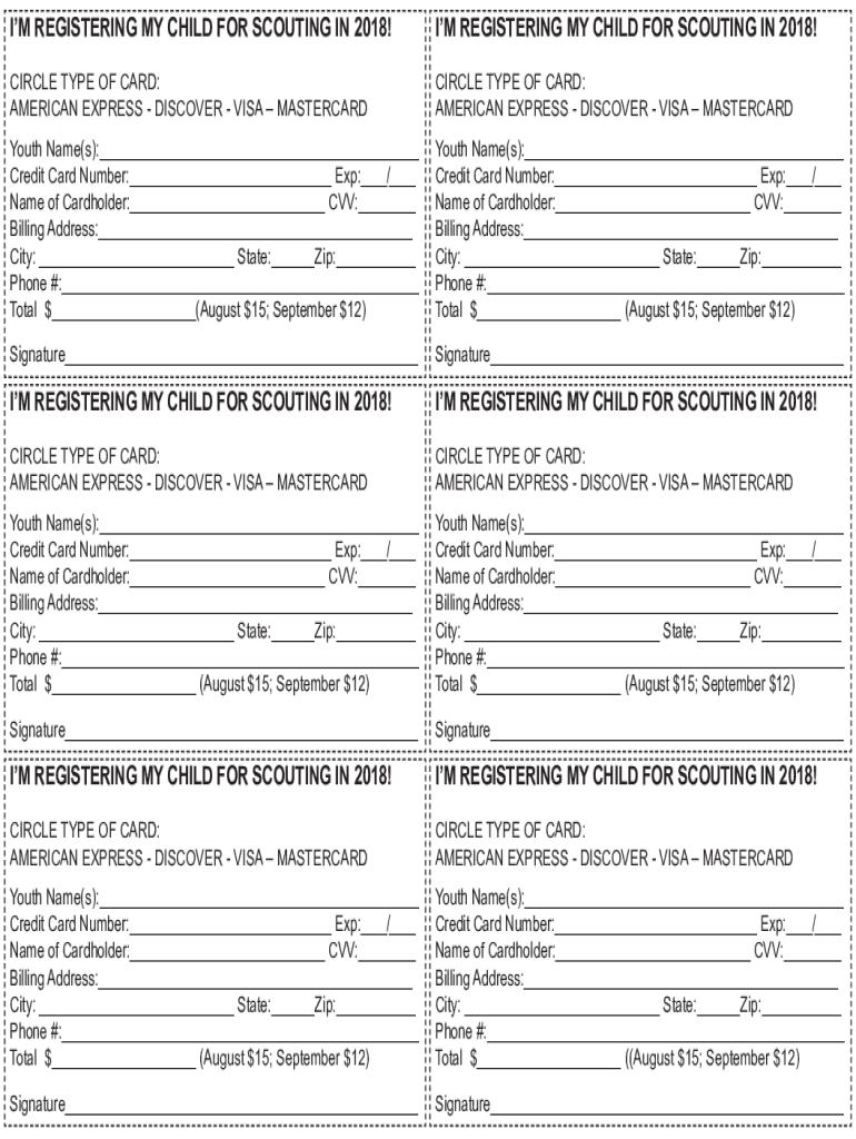 I'm REGISTERING MY CHILD FOR SCOUTING IN 2018! I'm REGISTERING MY CHILD FOR SCOUTING IN 2018!CIRCLE TYPE OF CARD: AMERICAN EXPRESS DISCOVER VISA MASTERCARDCIRCLE TYPE OF CARD: AMERICAN EXPRESS DISCOVER