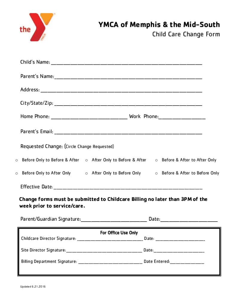 YMCA of Memphis & the MidSouth Child Care Change Orchids Name: Parents Name: Address: City/State/Zip: Home Phone: Work Phone: Parents Email: Requested Change: (Circle Change Requested) o Before Only