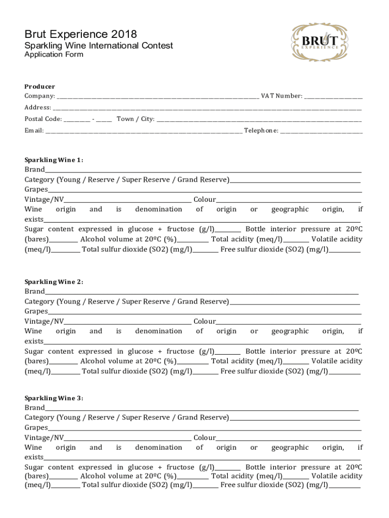 Brut Experience 2018 Sparkling Wine International ContestApplication FormProducerCompany: VAT Number: Address: Postal Code: Town / City: Email: Telephone: Sparkling Wine 1:Brand Category (Young /