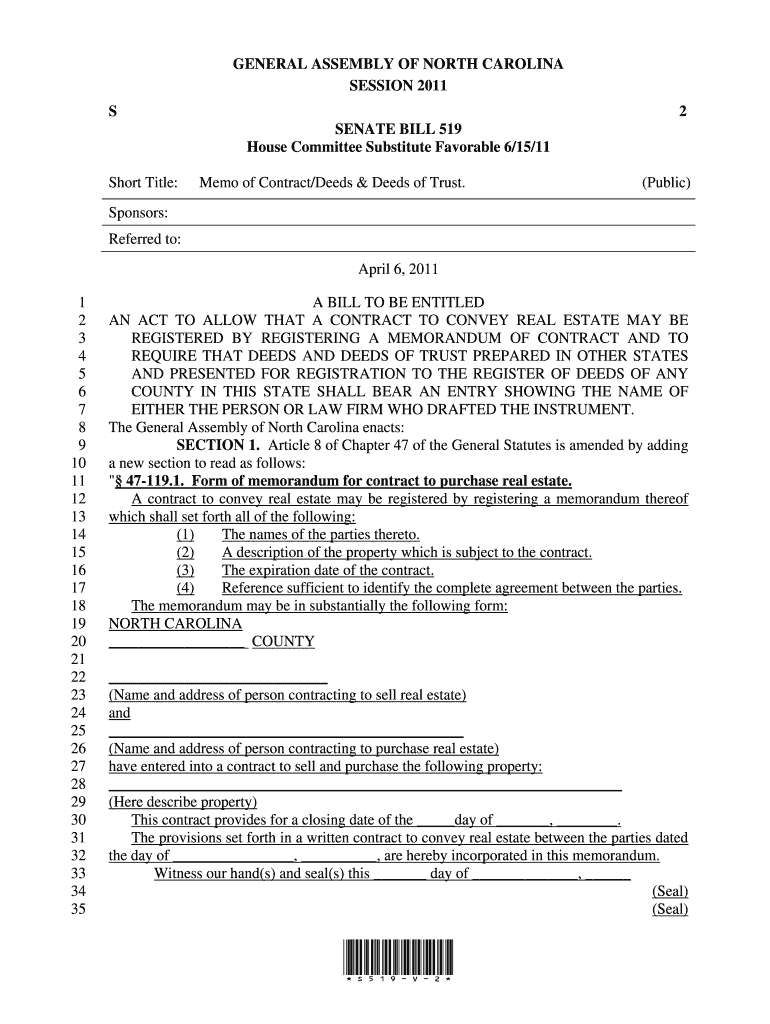 GENERAL ASSEMBLY OF NORTH CAROLINA SESSION 2011 S 2 SENATE BILL 519 House Committee Substitute Favorable 6/15/11 Short Title: Memo of Contract/Deeds & Deeds of Trust. (Public) Sponsors: Referred to: