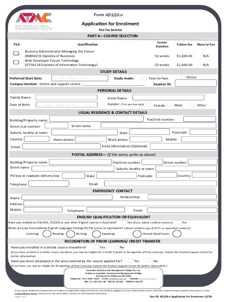 Form AD128.application for Enrollment Fee for Serviceman COURSE SELECTION Discourse DurationTuition Material Fee52 weeks$1,600.00 N/A52 weeks$1,600.00 N/AQualificationBusiness AdministratorManaging