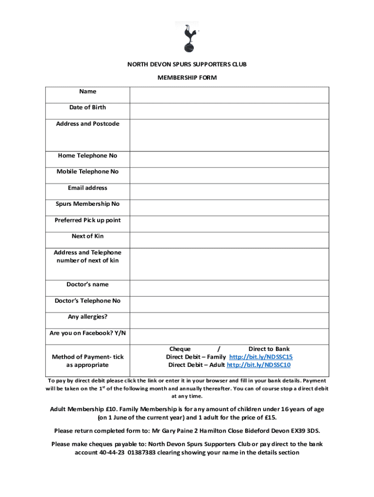 NORTH DEVON SPURS SUPPORTERS CLUB MEMBERSHIP FORM Name Date of Birth Address and PostcodeHome Telephone No Mobile Telephone No Email address Spurs Membership No Preferred Pick up point Next of Kin
