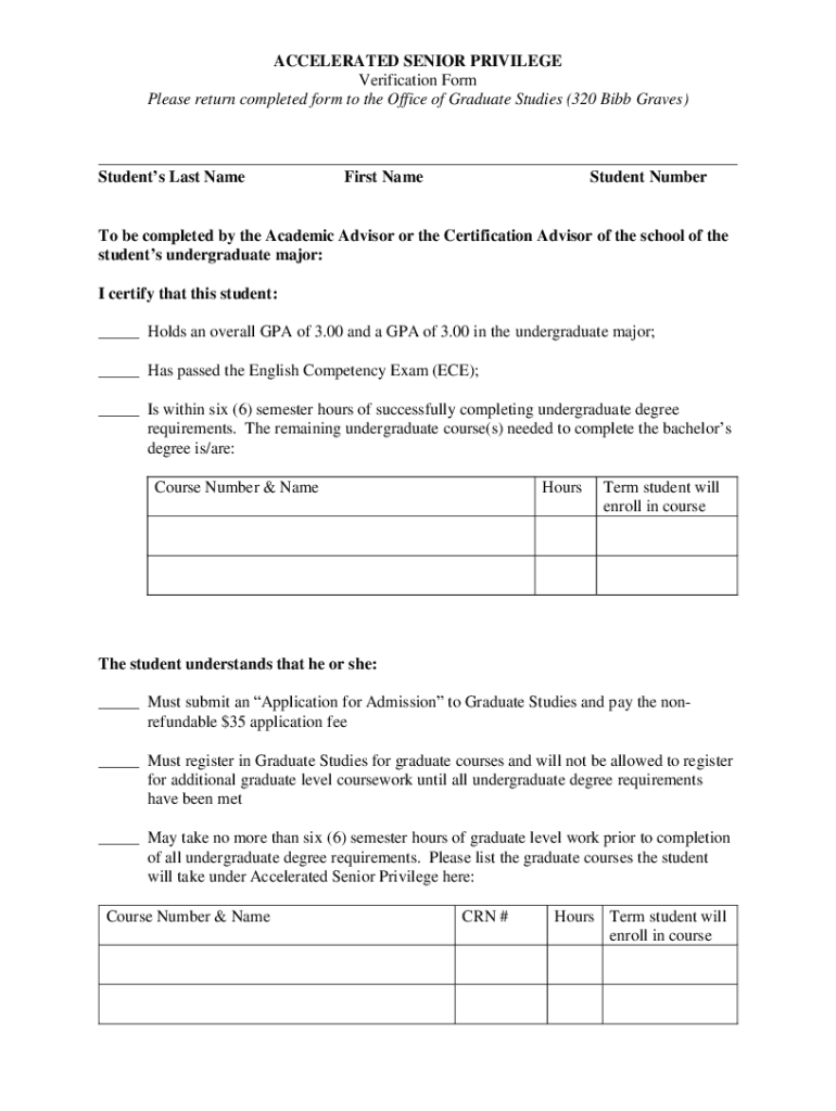ACCELERATED SENIOR PRIVILEGE Verification Form Please return completed form to the Office of Graduate Studies (320 BBB Graves) Students Last Name First Name Student Humberto be completed by the Academic