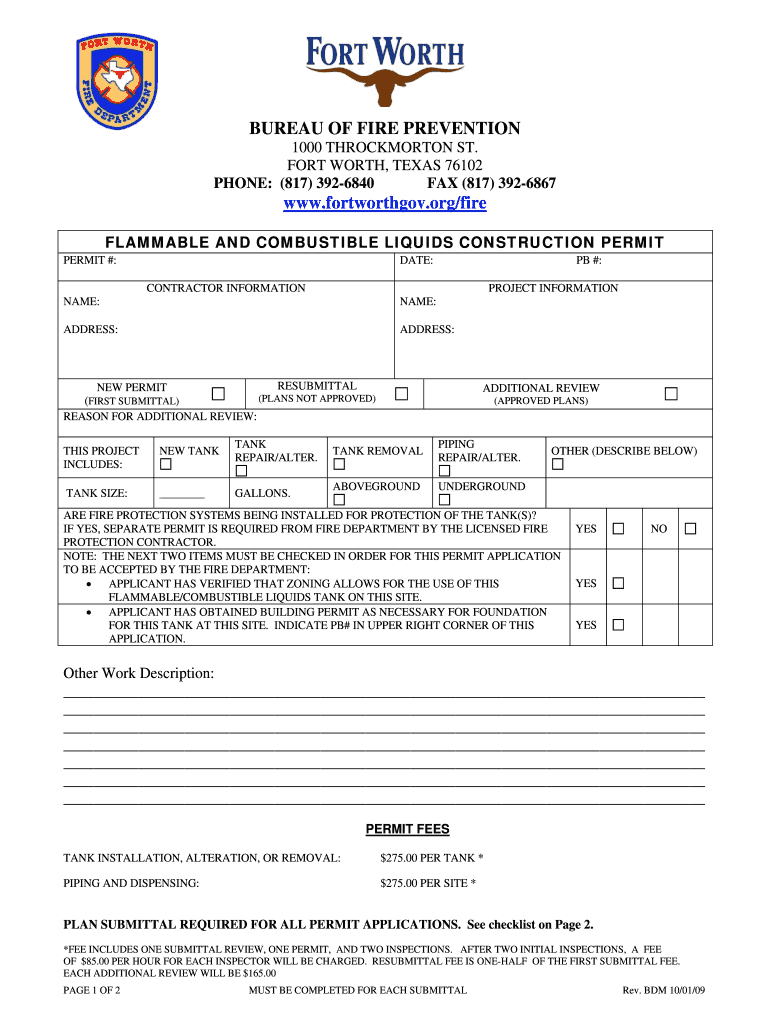 BUREAU OF FIRE PREVENTION 1000 THROCKMORTON ST. FORT WORTH, TEXAS 76102 PHONE: (817) 3926840 FAX (817) 3926867 www.fortworthgov.org/fire FLAMMABLE AND COMBUSTIBLE LIQUIDS CONSTRUCTION PERMIT #: DATE: