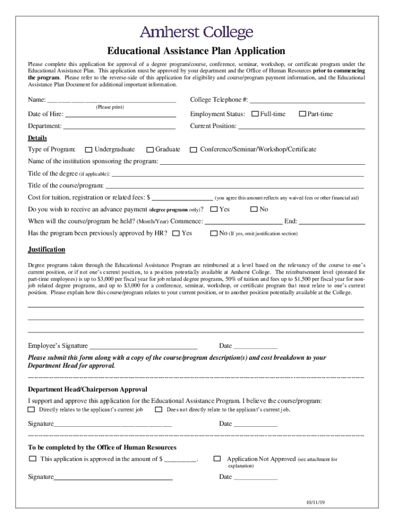 An application for educational assistance is a formal request submitted by individuals seeking financial support or resources to help cover the costs of their education, including tuition, books, and other related expenses.