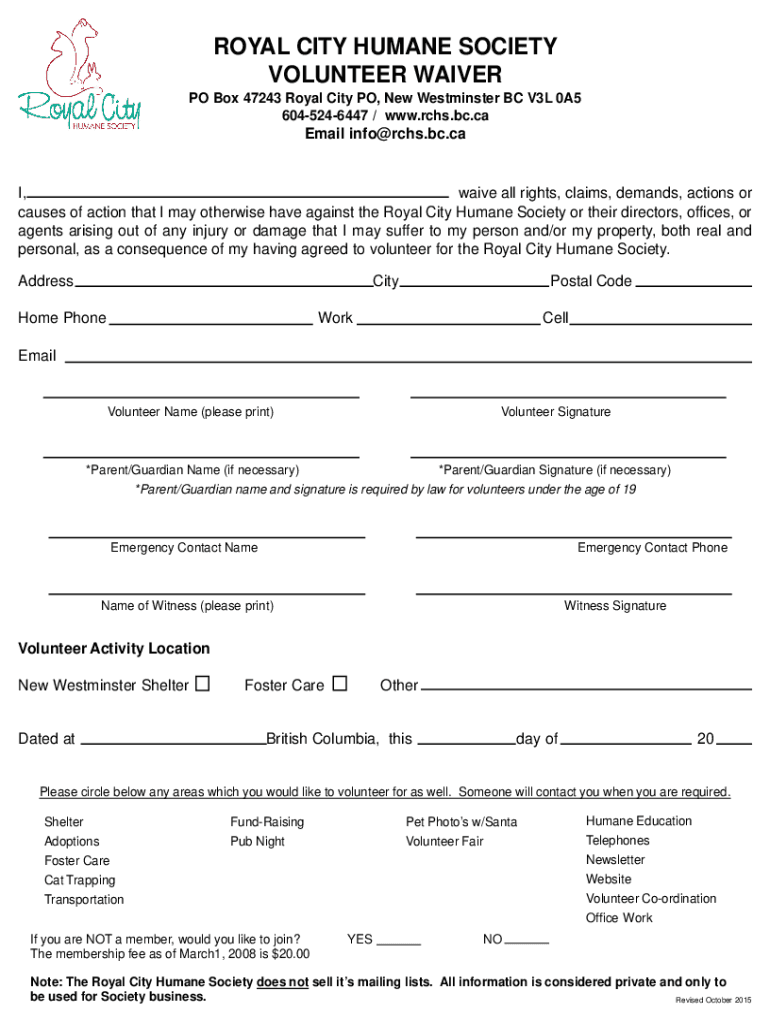 The form typically requires personal information, contact information, preferred volunteer activities, availability, and any prior experience with animals or volunteering.