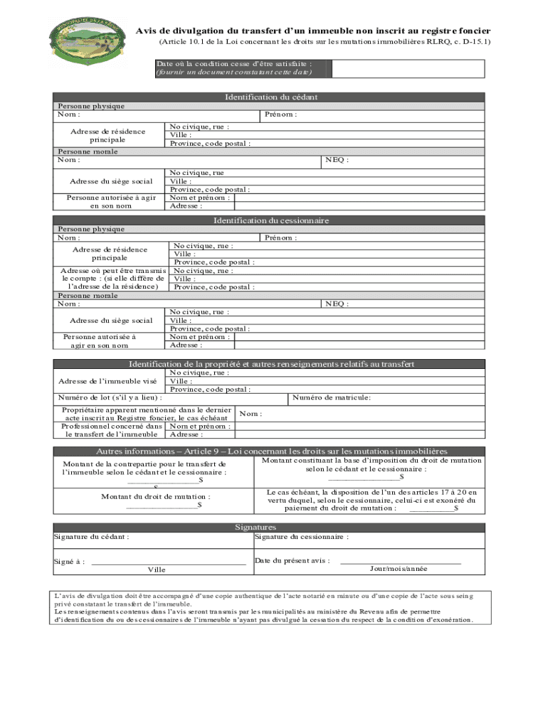 Avis de divulgation Du transfer dun immense non inherit AU register fancier (Article 10.1 DE la LOI concern ant LES droids SUR LES mutations immobilizes RRQ, c. D15.1) Date o la condition cease dare