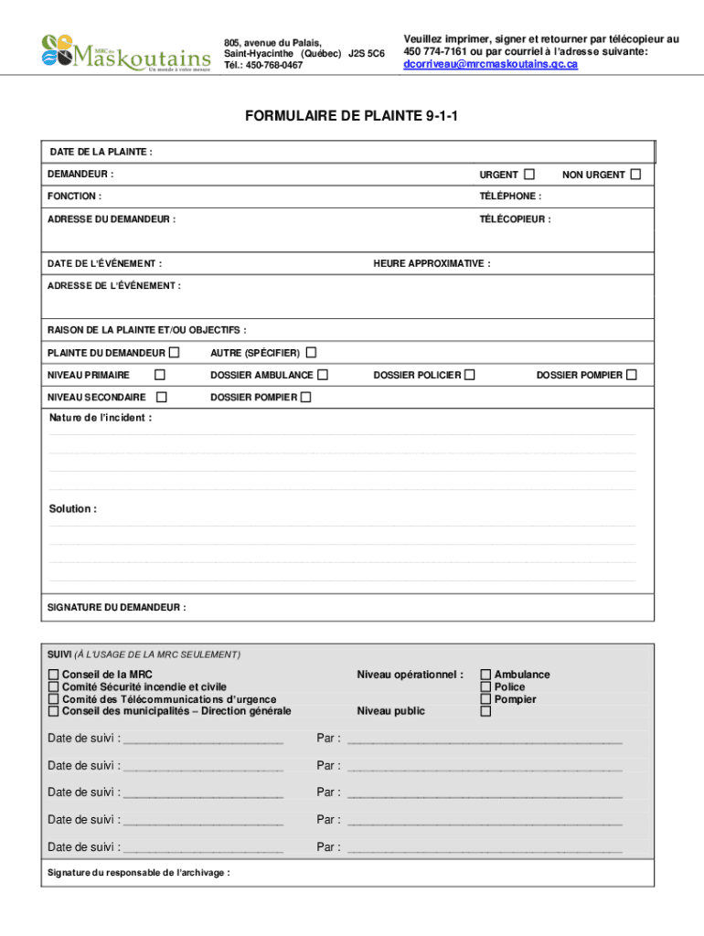 Obtenir le gratuit FORMULAIRE DE PLAINTE 9-1-1 - Saint-Simon