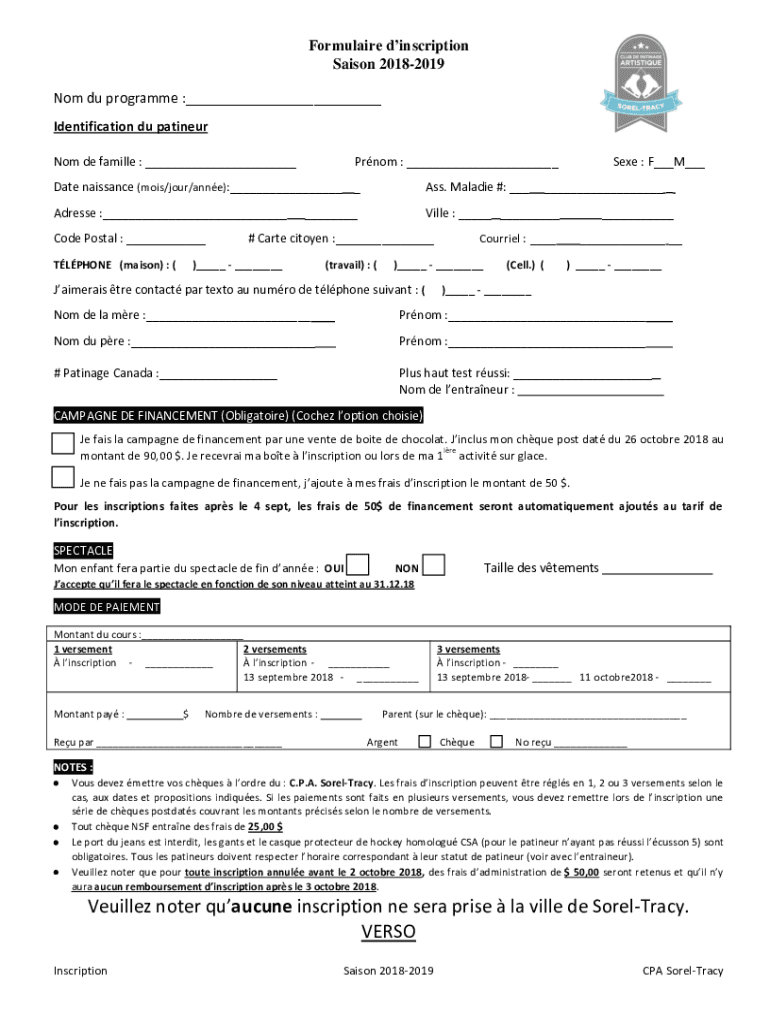Formula ire inscription Saigon 20182019 Not Du program : Identification Du Latiner Not DE Camille : Prom : Date Renaissance (moist/four/Anne): Ass. Maladies #: Address : Villa : Code Postal : PHONE