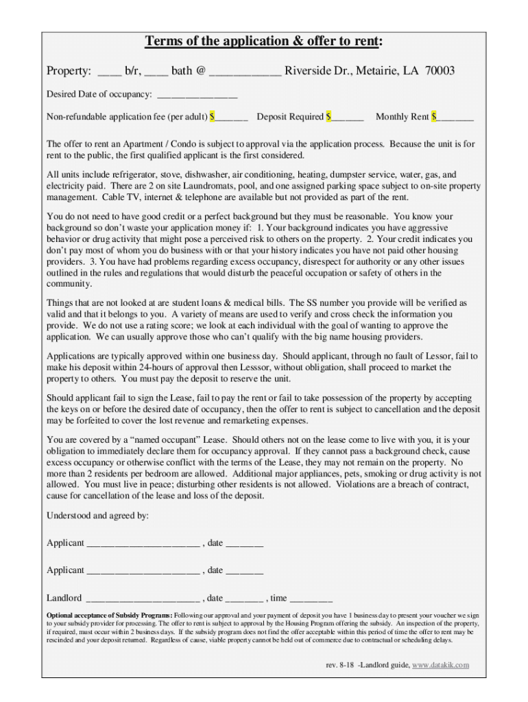 Terms of the application & offer to rent: Property: b/r, bath Riverside Dr., Metairie, LA 70003 Desired Date of occupancy: Nonrefundable application fee (per adult) $ Deposit Required $ Monthly Rent