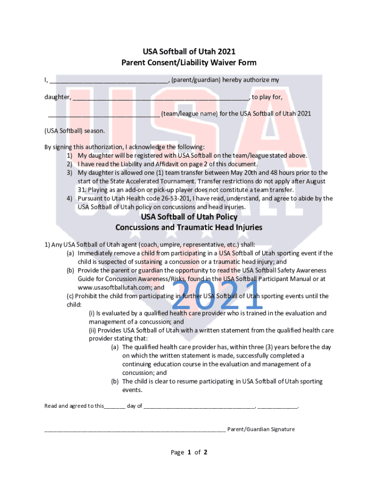 USA Softball of Utah 2021 Parent Consent/Liability Waiver Form I, (parent/guardian) hereby authorize my daughter, to play for, (team/league name) for the USA Softball of Utah 2021 (USA Softball) season.