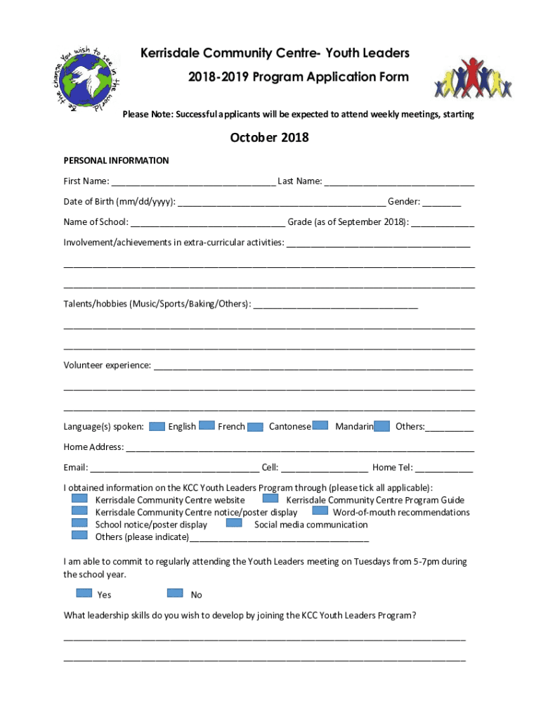 KerrisdaleCommunity Center Youth Leaders20182019 Program Application Form Please Note: Successful applicants will be expected to attend weekly meetings, starting October 2018 PERSONAL INFORMATION