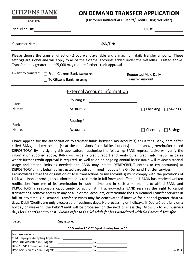 Get the free Citizens Bank On Demand Transfer Application