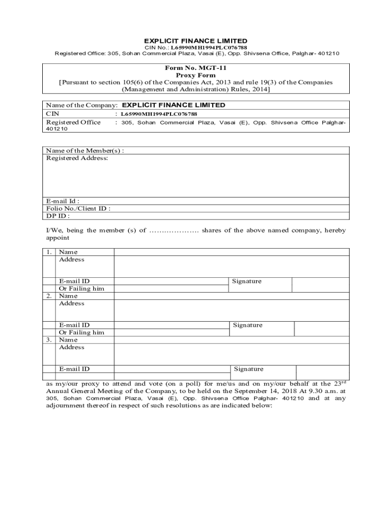 EXPLICIT FINANCE LIMITED IN No.: L65990MH1994PLC076788 Registered Office: 305, Shan Commercial Plaza, Kasai (E), Opp. Shipment Office, Palomar 401210Form No. MGT11 Proxy Form Pursuant to section 105(6)