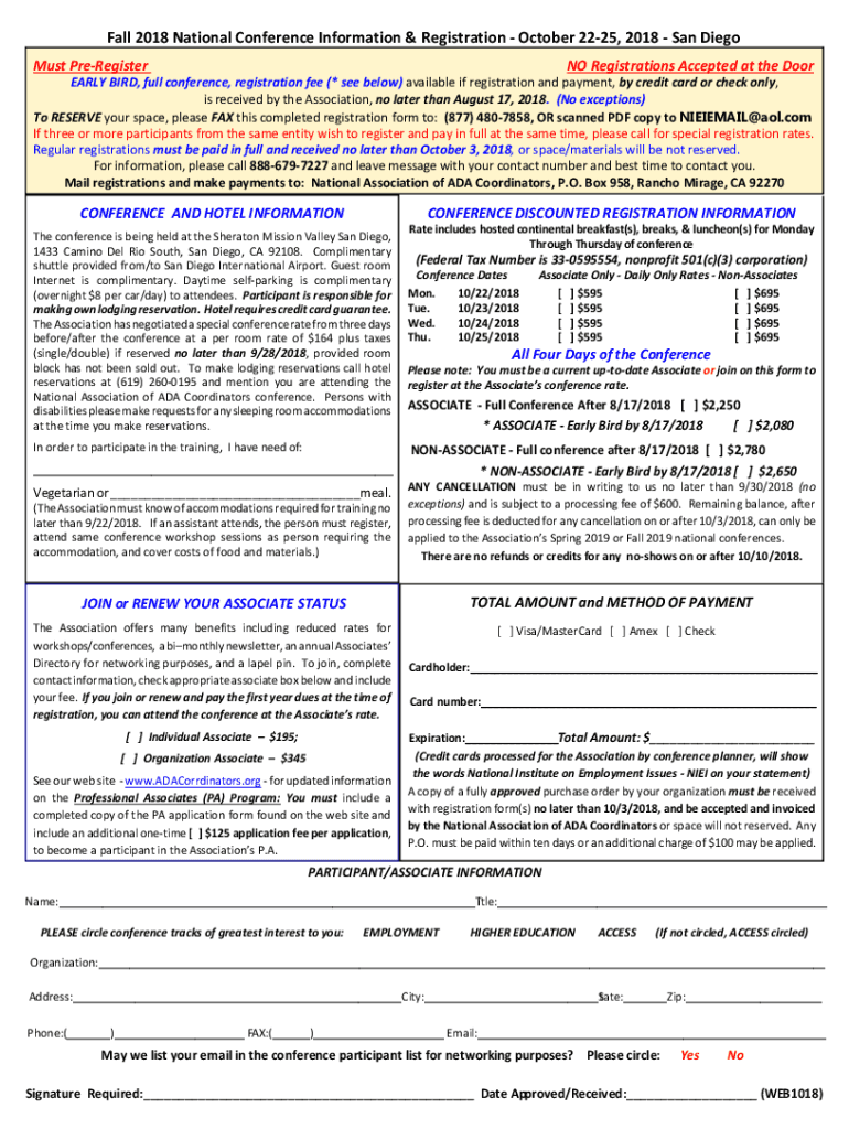 Fall 2018 National Conference Information & Registration October 2225, 2018 San Diego Must Preregister NO Registrations Accepted at the Doorway BIRD, full conference, registration fee (* see below)