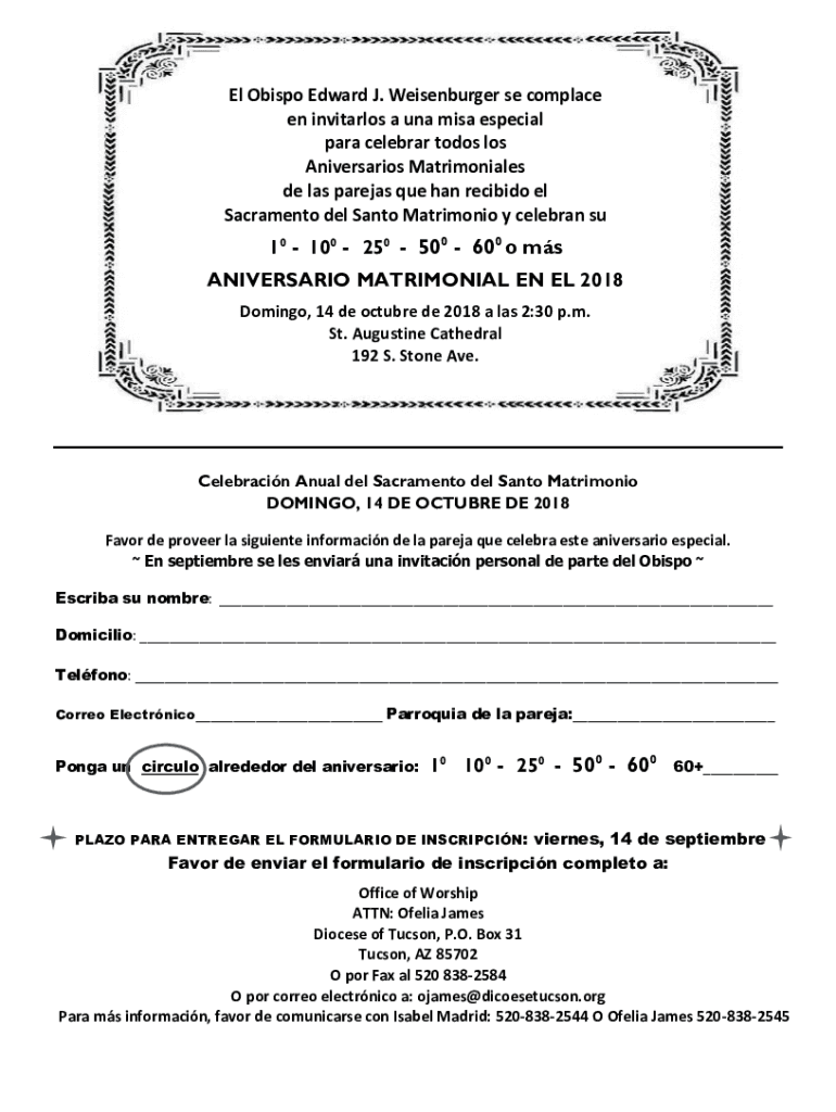 El Obis Edward J. Weinberger SE com place en invitation an RNA miss especial para celebrate to-dos Los Anniversaries Matrimonial BS de leis paras Que Han recited el Sacramento Del Santa Matrimonial