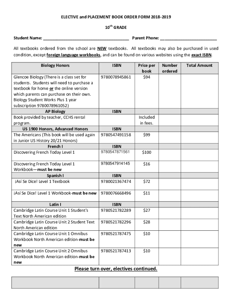 ELECTIVE and PLACEMENT BOOK ORDER FORM 20182019 10th GRADE Student Name: Parent Phone: All textbooks ordered from the school are NEW textbooks. All textbooks may also be purchased in used condition,