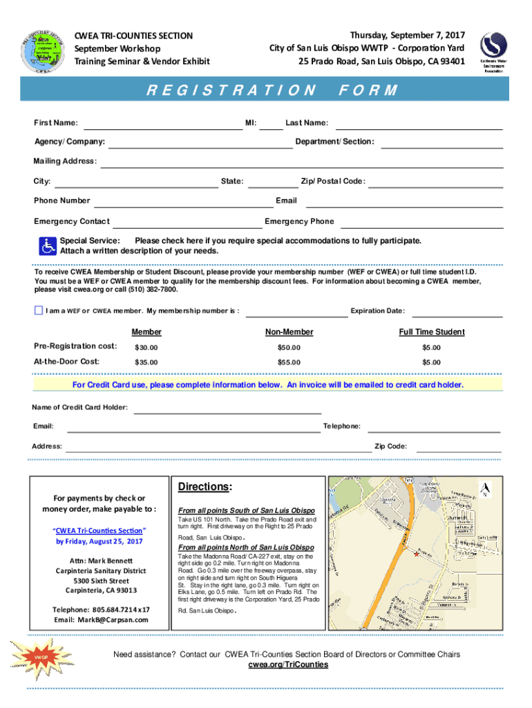 Thursday,September7,2017 CWEATRICOUNTIESSECTION CityofSanLuisObispoWWTPCorpora onward SeptemberWorkshop 25PradoRoad,SanLuisObispo,CA93401 TrainingSeminar&VendorExhibitREGISTRATION First Name:MI:Agency/