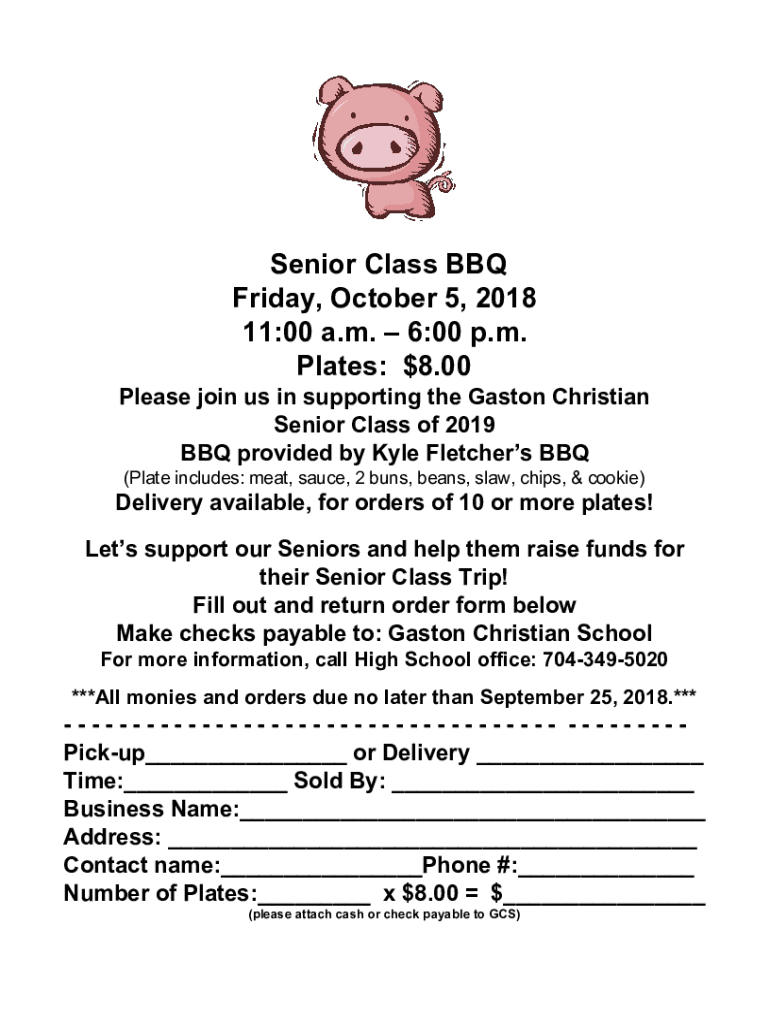 Senior Class BBQ Friday, October 5, 2018 11:00 a.m. 6:00 p.m. Plates: $8.00 Please join us in supporting the Gaston Christian Senior Class of 2019 BBQ provided by Kyle Fletcher's BBQ (Plate includes:
