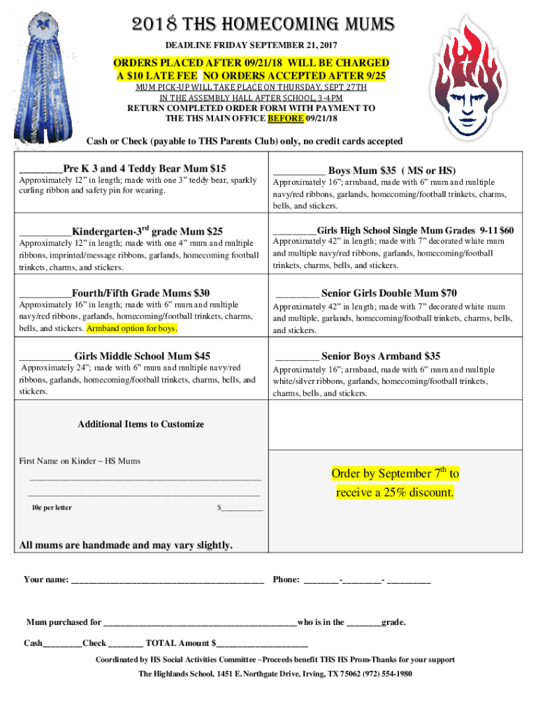 2018 THS HOMECOMING SUMS DEADLINE FRIDAY, SEPTEMBER 21, 2017ORDERS PLACED AFTER 09/21/18 WILL BE CHARGED A $10 LATE FEE NO ORDERS ACCEPTED AFTER 9/25 MUM PICKUP WILL TAKE PLACE ON THURSDAY, SEPT 27TH