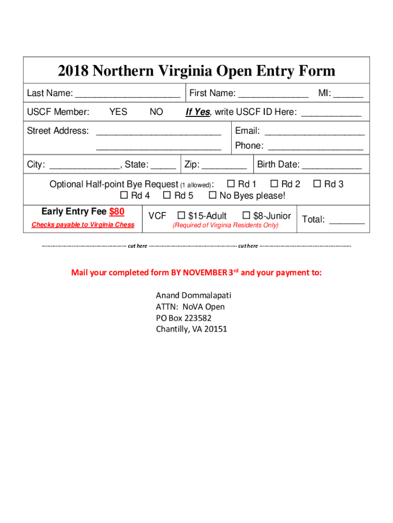 2018 Northern Virginia Open Entry Form Last Name: USCF Member:YESNOFirst Name: MI: If Yes, write USCF ID Here: Street Address: Email: Phone: City:, State: Zip: Birth Date: Optional Half point Bye