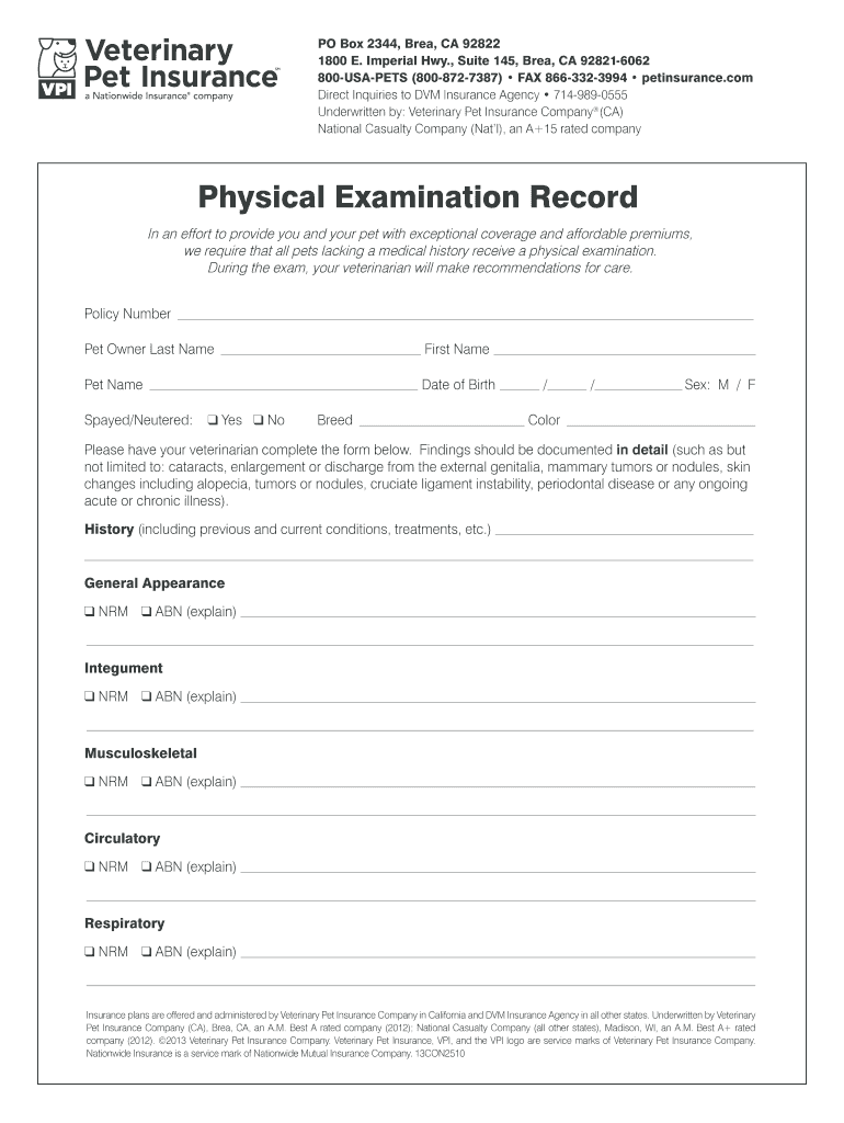 The Pet Physical Examination Record is a medical consent form used by veterinarians to document the health status of pets for insurance purposes.
