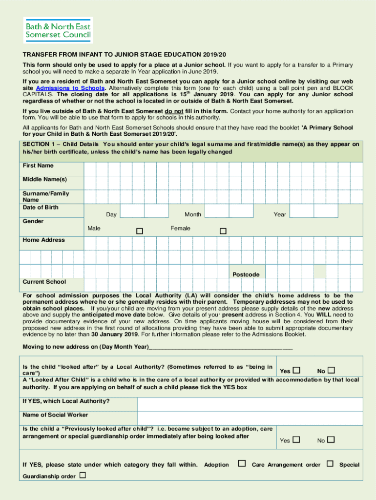 This form should only be used to apply for a place at a Junior school. If you want to apply for a transfer to a Primary