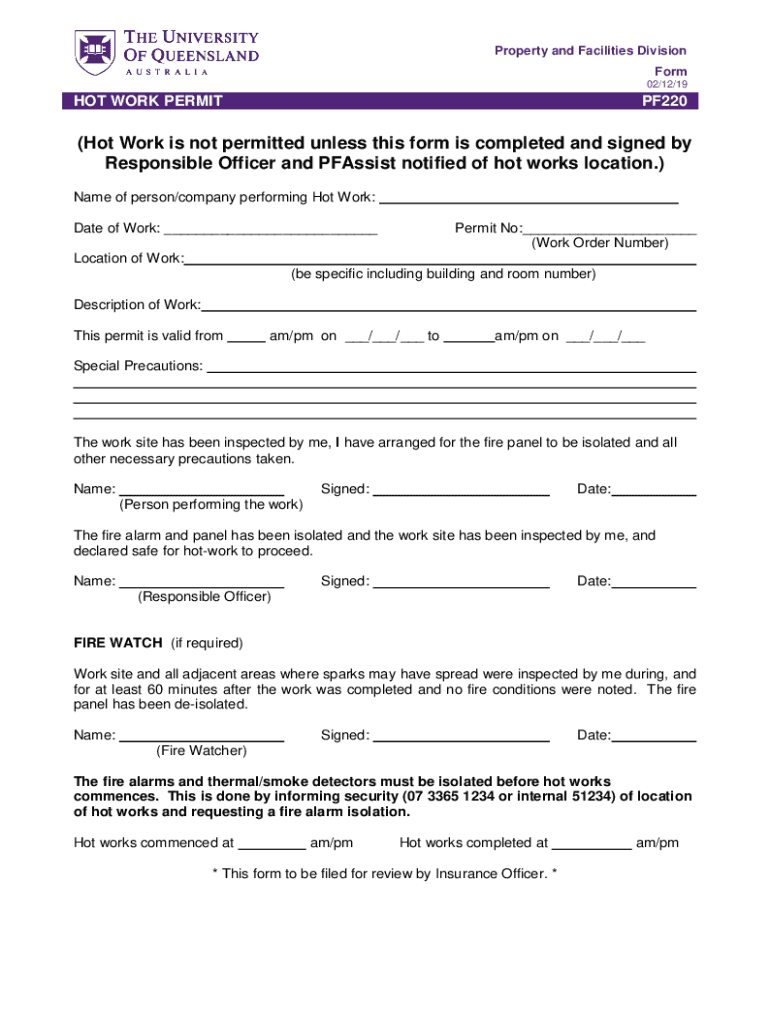 Property and Facilities Division Form 02/12/19HOT WORK PERMITPF220(Hot Work is not permitted unless this form is completed and signed by Responsible Officer and Assist notified of hot works location.)