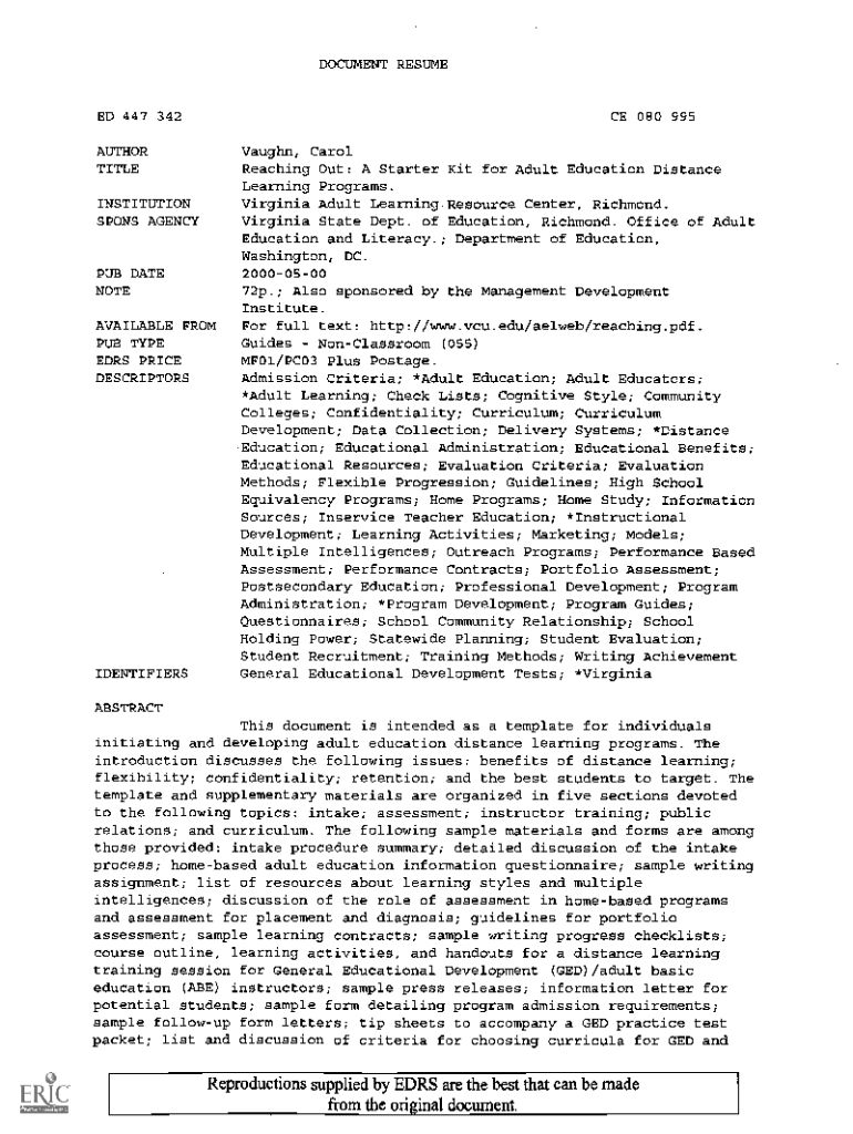 Get the free Reaching Out: A Starter Kit for Adult Education Distance Learning ...