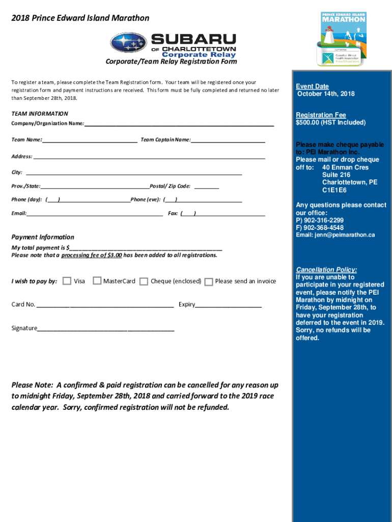 2018 Prince Edward Island Marathon. Corporate/Team Relay Registration Form To register a team, please complete the Team Registration form. Your team will be registered once your registration form