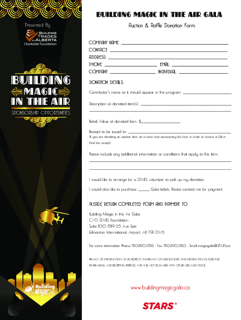 BUILDING MAGIC IN THE AIR GALA Presented By:Building magic in the air SPONSORSHIP OPPORTUNITIESAuction & Raffle Donation Form COMPANY NAME: CONTACT: ADDRESS: PHONE: EMAIL: COMPANY: INDIVIDUAL: DONATION