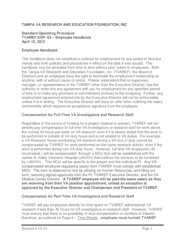 TAMPA VA RESEARCH AND EDUCATION FOUNDATION, INC Standard Operating Procedure TUAREG SOP 03 Employee Handbook April 15, 2012, Employee Handbook This handbook does not constitute a contract for employment