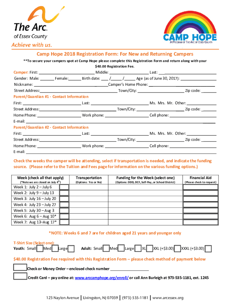 2018 Guide for The Arc of Essex Counties Camp Hope Registration and Application Process Thank you for your interest in Camp Hope. The Arc of Essex Counties Camp Hope Program has been providing summer