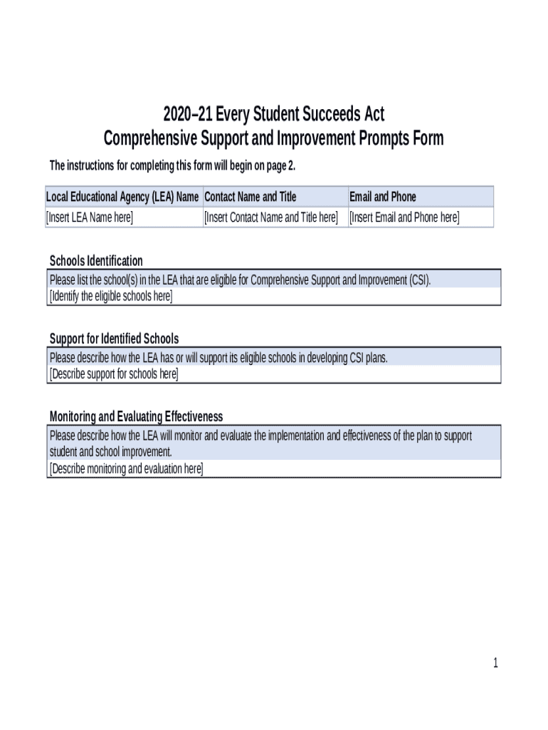 What is 2020-21 CSI Prompts - Title I, Part A(CA Dept of Education). for the Comprehensive Support and Improvement (CSI) prompts for local educational agencies and county offices of education. Form?