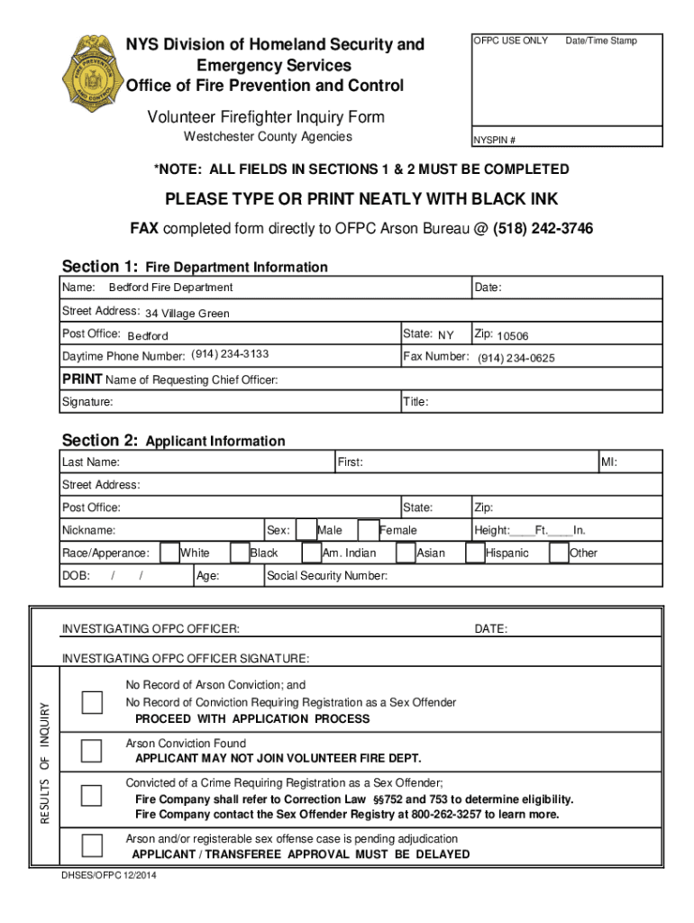 NYS Division of Homeland Security and Emergency Services Office of Fire Prevention and ControlOFPC USE Validate/Time StampVolunteer Firefighter Inquiry Form Westchester County AgenciesNYSPIN #*NOTE: