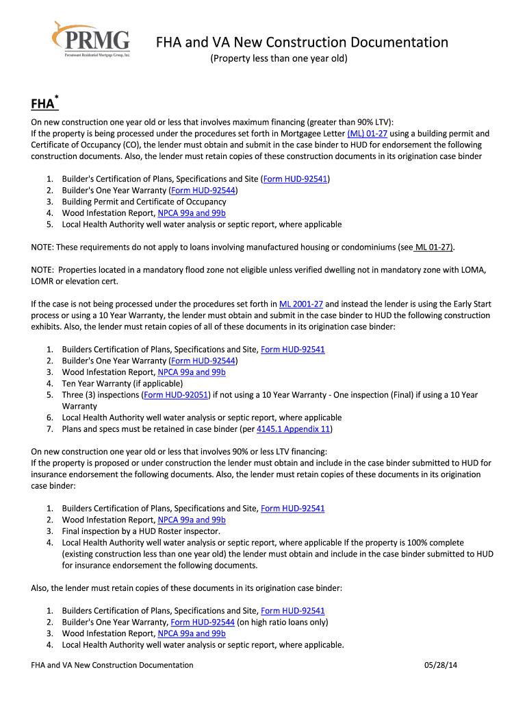 FHA and VA New Construction Documentation (Property less than one year old) FHA* On new construction one-year-old or less that involves maximum financing (greater than 90% LTV): If the property is
