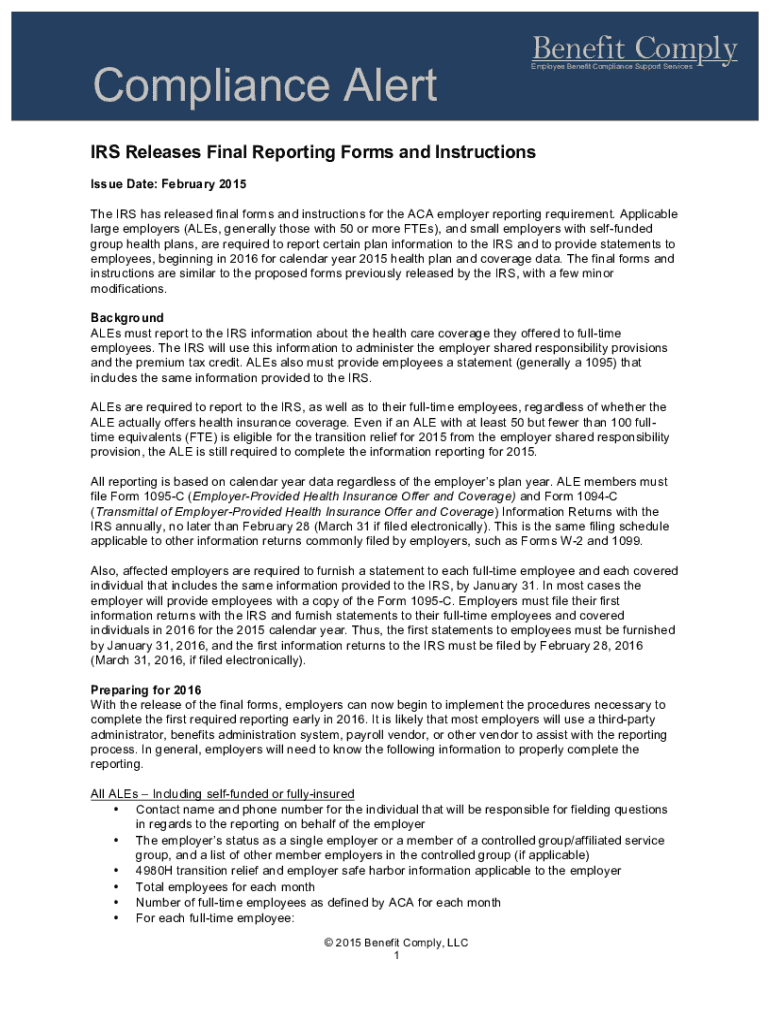 Employee Benefit Compliance Support Services IRS Releases Final Reporting Forms and Instructions