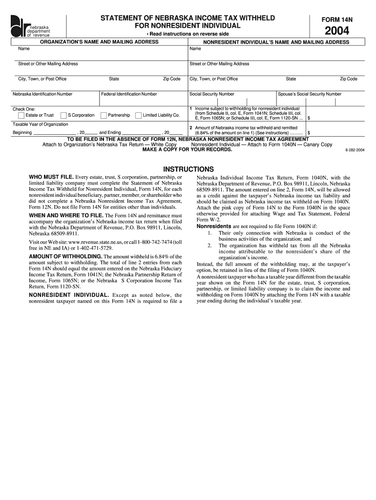 The Nebraska Income Tax Withheld Form 14N is a tax document used by nonresident individuals to report income tax withheld by Nebraska organizations.