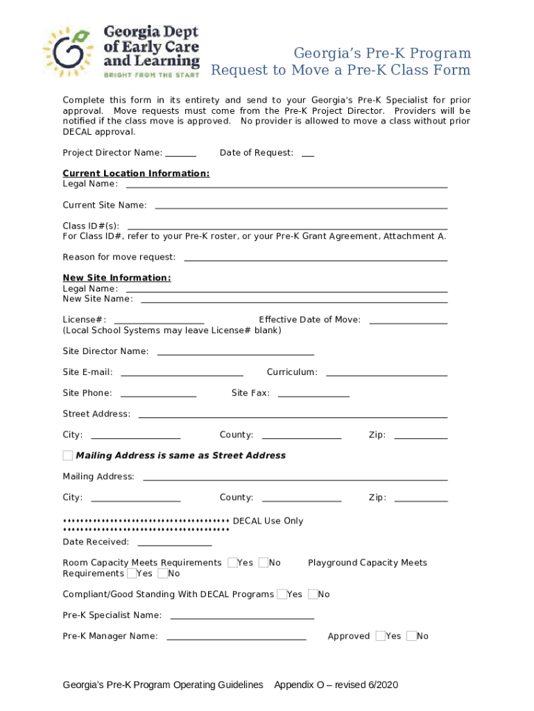 What is Georgia's Pre-K Program Request to Move a Pre-K Class ... Form?