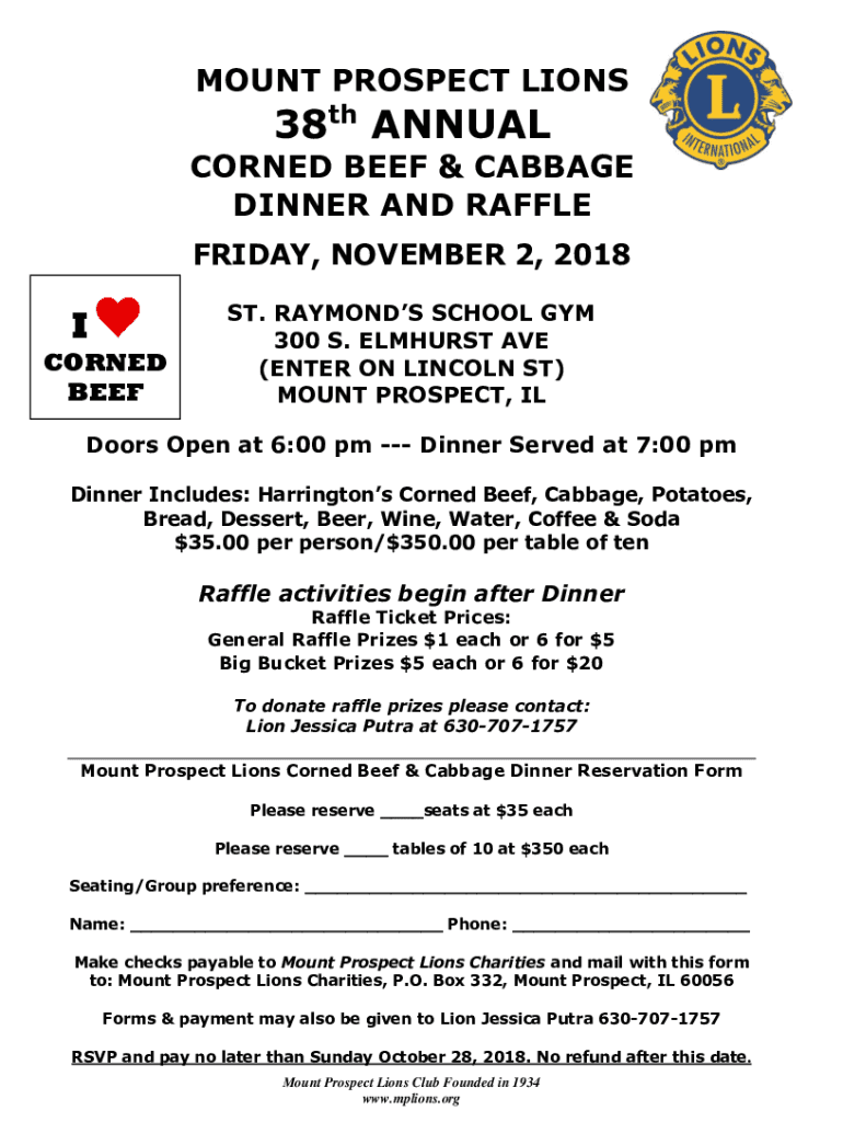 MOUNT PROSPECT LIONS38th ANNUAL CORNED BEEF & CABBAGE DINNER AND RAFFLE FRIDAY, NOVEMBER 2, 2018I CORNED BEEFS. RAYMOND SCHOOL GYM 300 S. ELMHURST AVE (ENTER ON LINCOLN ST) MOUNT PROSPECT, Indoors