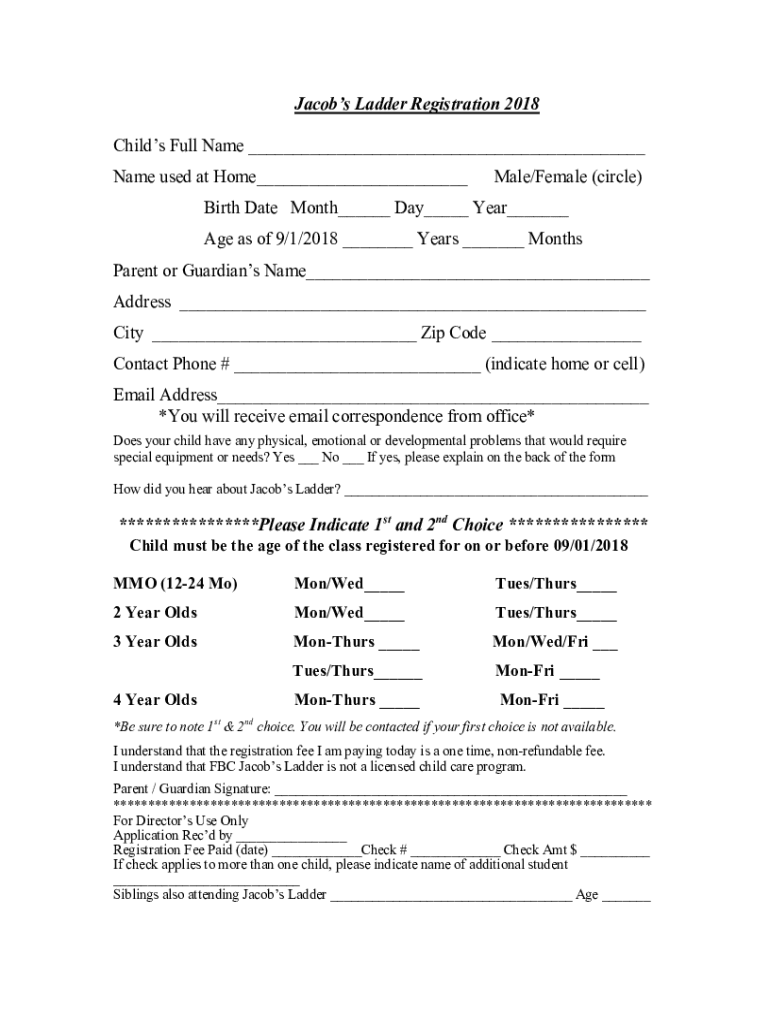Jacobs Ladder Registration 2018 Child's Full Name used at Home Male/Female (circle)Birth Date Month Day Year Age as of 9/1/2018 Years Months Parent or Guardians Name Address City Zip Code Contact