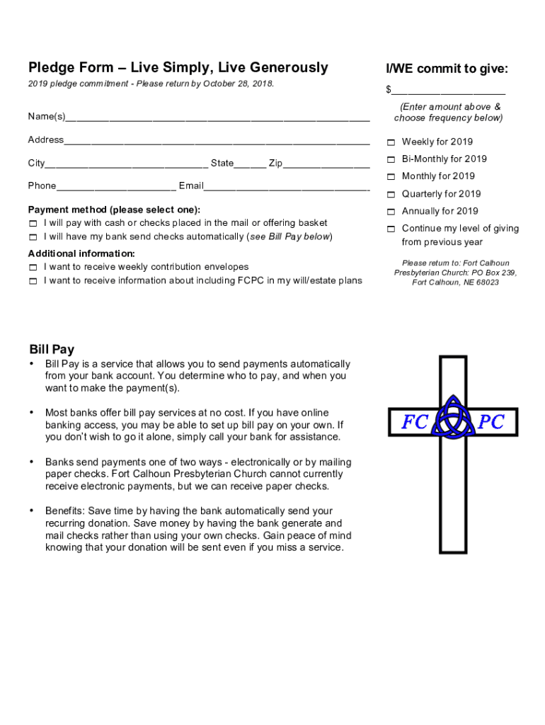 Pledge Form Live Simply, Live Generously 2019 pledge commitment Please return by October 28, 2018. Name(s) I/WE commit to give: $ (Enter amount above & choose frequency below)Address ! Weekly for