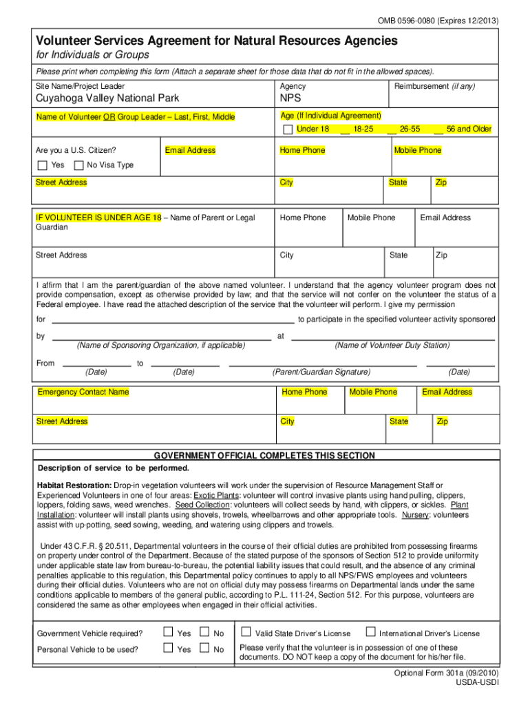 OMB 05960080 (Expires 12/2013)Volunteer Services Agreement for Natural Resources Agencies for Individuals or Groups Please print when completing this form (Attach a separate sheet for those data that