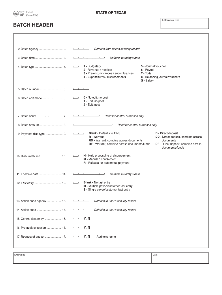 The Texas Batch Header Form is designed for use by state and local government agencies managing financial transactions, including payroll, budgetary, and revenue processes.