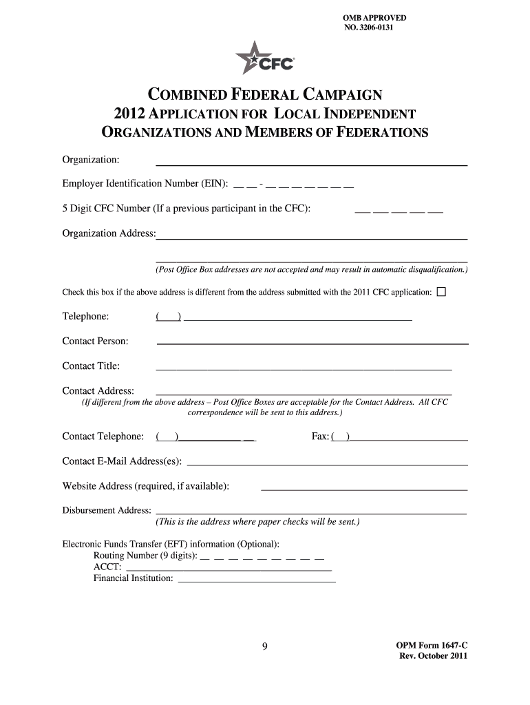 The Combined Federal Campaign Application is an application form used by local independent organizations and federation members to apply for participation in the Combined Federal Campaign (CFC).