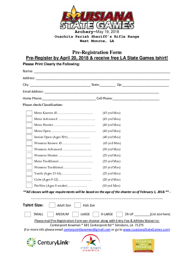 Archery May 19, 2018, Wichita Parish Sheriffs Rifle Range West Monroe, Preregistration Form Preregisters by April 20, 2018 & receive free LA State Games shirt! Please Print Clearly the Following:Name: