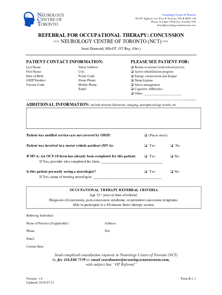 Neurology Center of Toronto 100491 Clinton Ave West Toronto, ON M5N 1A8 Phone: 4168607554 Fax: 4168607559 admin neurologycentretoronto. Referral FOR OCCUPATIONAL THERAPY: CONCUSSION NEUROLOGY Center