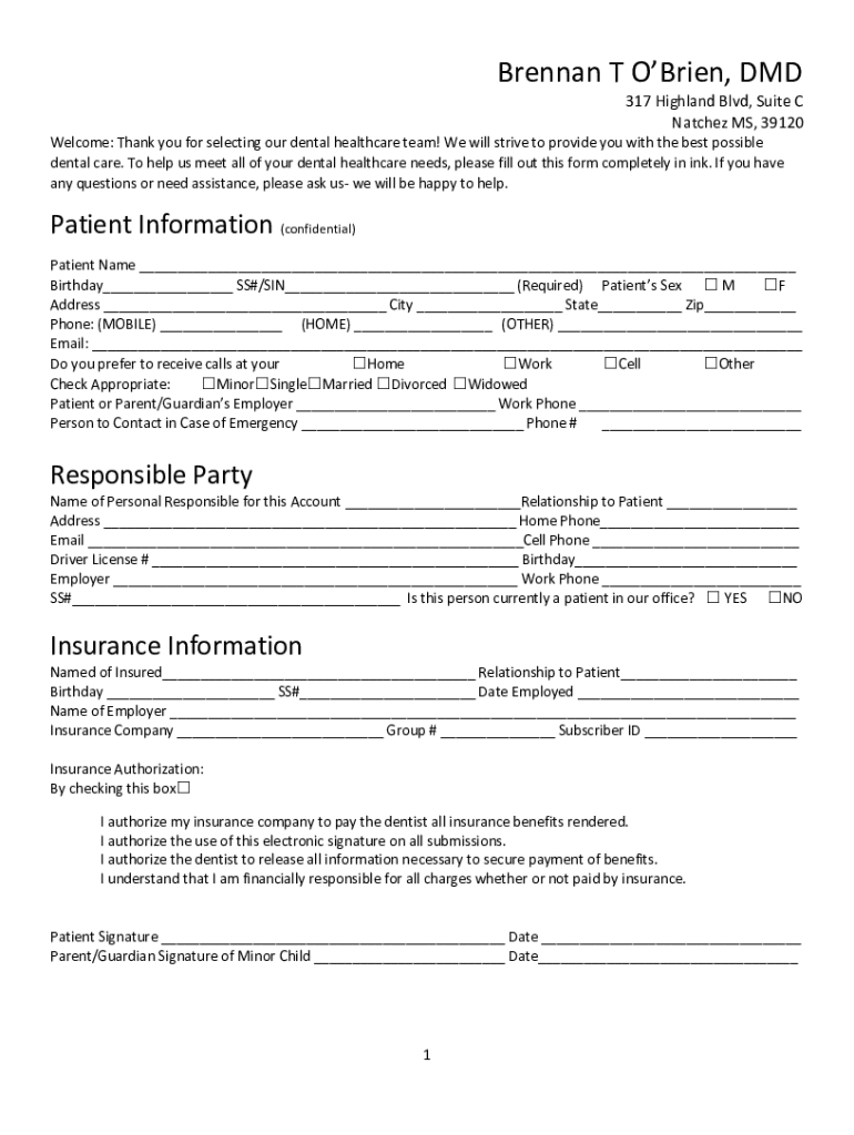 Brennan TO Brien, DMD 317 Highland Blvd, Suite C Natchez MS, 39120Welcome: Thank you for selecting our dental healthcare team! We will strive to provide you with the best possible dental care. To