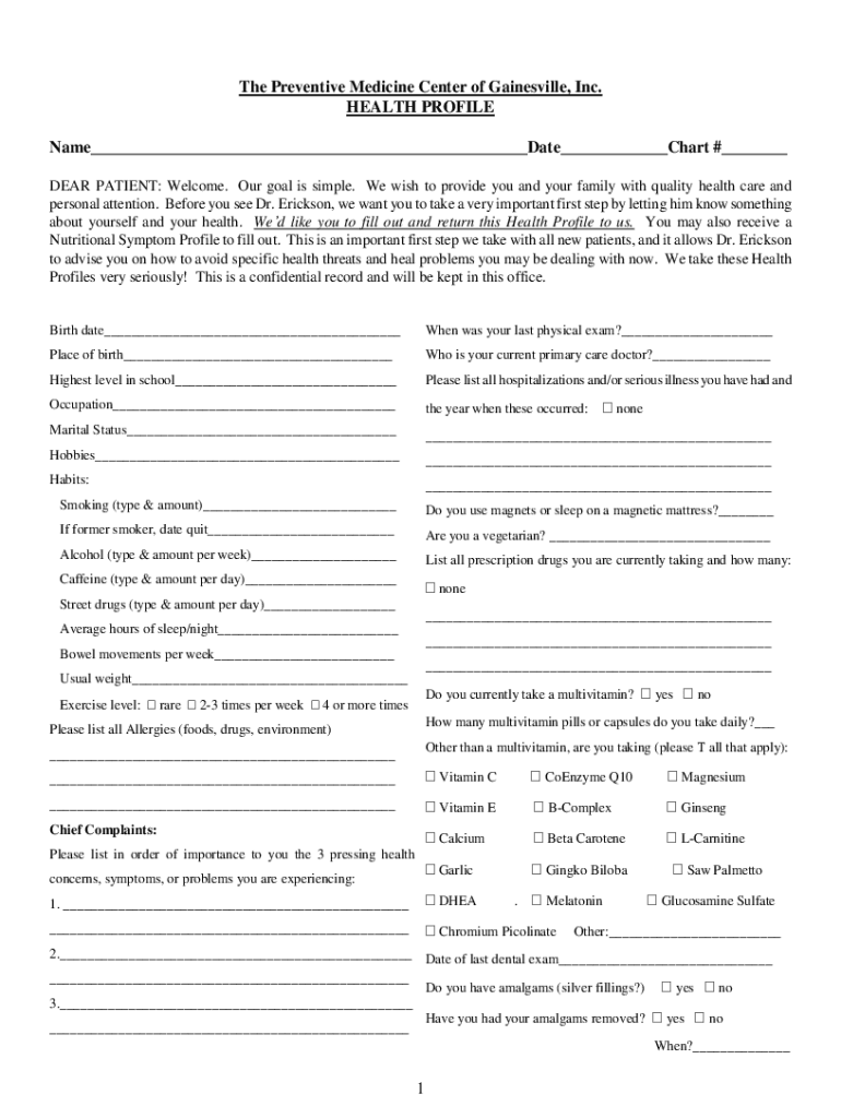 The Preventive Medicine Center of Gainesville, Inc. HEALTH PROFILE Name Date Chart # DEAR PATIENT: Welcome. Our goal is simple. We wish to provide you and your family with quality health care and